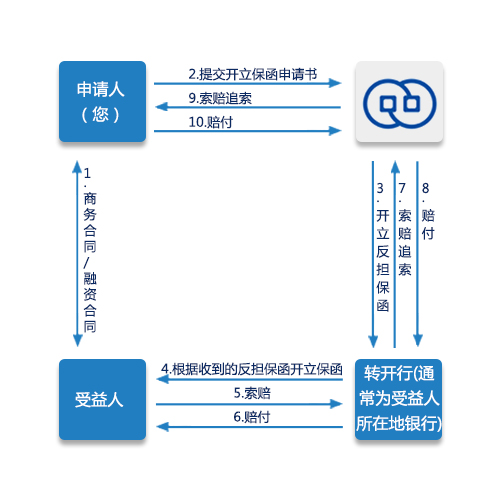 有些情况下(如有些国家法律规定保函必须由当地银行开出),我行开立的保函需委托其他银行进行转开(业务流程见示意图),转开保函应根据受委托银行(转开行)的习惯做法和所在国家(地区)的有关规定办理,保函转开费由申请人负担。
